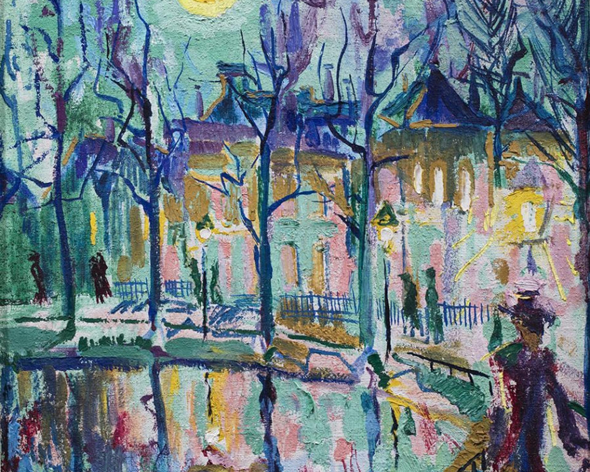 Stadsgezicht bij maanlicht