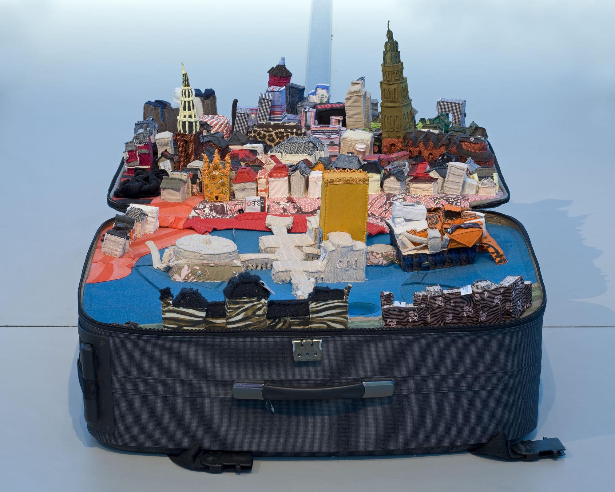 Speciaal voor haar solotentoonstelling in Groningen (2012) maakte Yin Xiuzhen een koffertje met daarin Groningen verbeeld als miniatuur stadje. Deze variant maakt deel uit van de serie Portable Cities die Yin Xiuzhen vanaf het begin van het millennium maakte. Aanleiding daarvoor was dat Yin in de jaren negentig steeds meer tentoonstellingen in het buitenland kreeg en daardoor steeds meer op reis was. Op de vliegvelden vielen haar de lopende banden op waar iedereen op zijn koffers wachtte en ze stelde zich voor hoe de inhoud van de koffers ieders thuis vertegenwoordigde. De koffers tonen Yins persoonlijke ervaringen met en herinneringen aan een specifieke stad. Hoe beter Yin vertrouwt is met een plek, hoe meer een cityscape bestaat uit persoonlijke elementen, herinneringen en indrukken. Haar verbeelding Bejing, haar thuisstad, is bijvoorbeeld tamelijk abstract. Toeristische trekpleisters zijn niet te vinden. In plaats daarvan is in het midden een gat, waardoor een vergrootglas een kaart is te zien van het oude centrum van de stad. Andere steden die zij minder goed kent, hebben duidelijk herkenbare elementen. Zo zijn op de Groninger variant, die u hier ziet, onder andere het Groninger Museum en de Martinitoren duidelijk te herkennen. Alle Portable Cities zijn gemaakt van kleding van bewoners van de betreffende stad, en ze hebben ook allemaal een soundtrack die opgenomen is in de desbetreffende stad. De Groningse koffer is gemaakt van kleding van museummedewerkers en de geluiden die te horen zijn, zijn opgenomen op een avond waarop het Nederland tijdens het Europees kampioenschap voetbal tegen Duitsland speelde en verloor. Ook is de bekende Groninger zanger Ede Staal te horen.